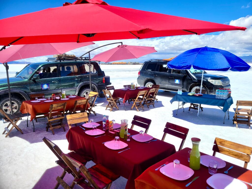 Salimos del hotel a las 10:00 A.M. Después, continuamos hacia la Población de Colchani donde observamos el proceso de la sal, artesanía y recuerdos de Sal, luego nos dirigimos al Salar de Uyuni con más de 12.000 km2. visitando los montículos de Sal listos para ser transportados y procesados, llegamos al hotel o Museo de Sal Playa Blanca lugar donde se puede apreciar las banderas de muchos países el monumento al Dakar (almorcamos) y continuaremos visitando la Isla Incahuasi (esta Isla solo es accesible en época seca) para ver los cactus gigantes y tener vista panorámica hacia alrededor del Salar. Después, continuando el recorrido del Salar, nos dirigimos a un lugar plano y seco para tomar fotos con perspectiva. También tenemos la oportunidad de ver la puesta de sol en el Salar, llegando a Uyuni a las 19:00 P.M.